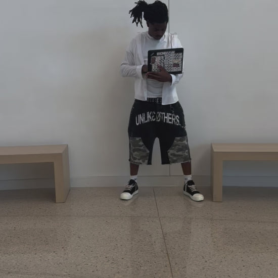 Sturdy oversized denim shorts featuring rhinestones, a leather label, and camouflage-stitched knee patches.